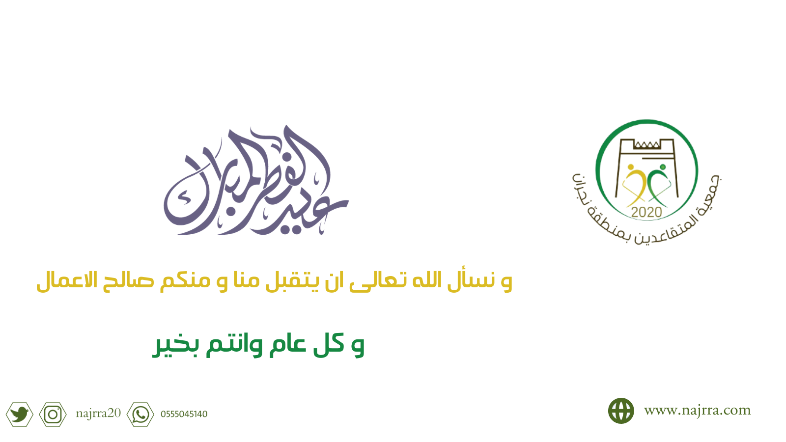 اقرء المزيدتتقدم جمعية المتقاعدين بمنطقة نجران ممثلة بكافة أعضائها ومنسوبيها بخالص التهاني وأصدق الأماني و التبريكات لمقام خادم الحرمين الشريفين الملك سلمان بن عبدالعزيز ال سعود و ولي عهده الأمين الأمير محمد بن سلمان بن عبدالعزيز ال سعود والشعب السعودي الكريم والأمة الإسلامية بمناسبة حلول عيد الفطر المبارك. وكل عام عام وانتم بخير